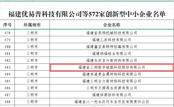 10月27日,福建省工業(yè)和信息化廳公布2025年度創(chuàng)新型中小企業(yè)名單,三明市數據集團合資企業(yè)——福建省三明數字城服科技股份有限公司(以下簡稱“三明數字城服公司”)憑借其在技術創(chuàng)新與場景應用方面的綜合實力,成功入選“創(chuàng)新型中小企業(yè)”。
